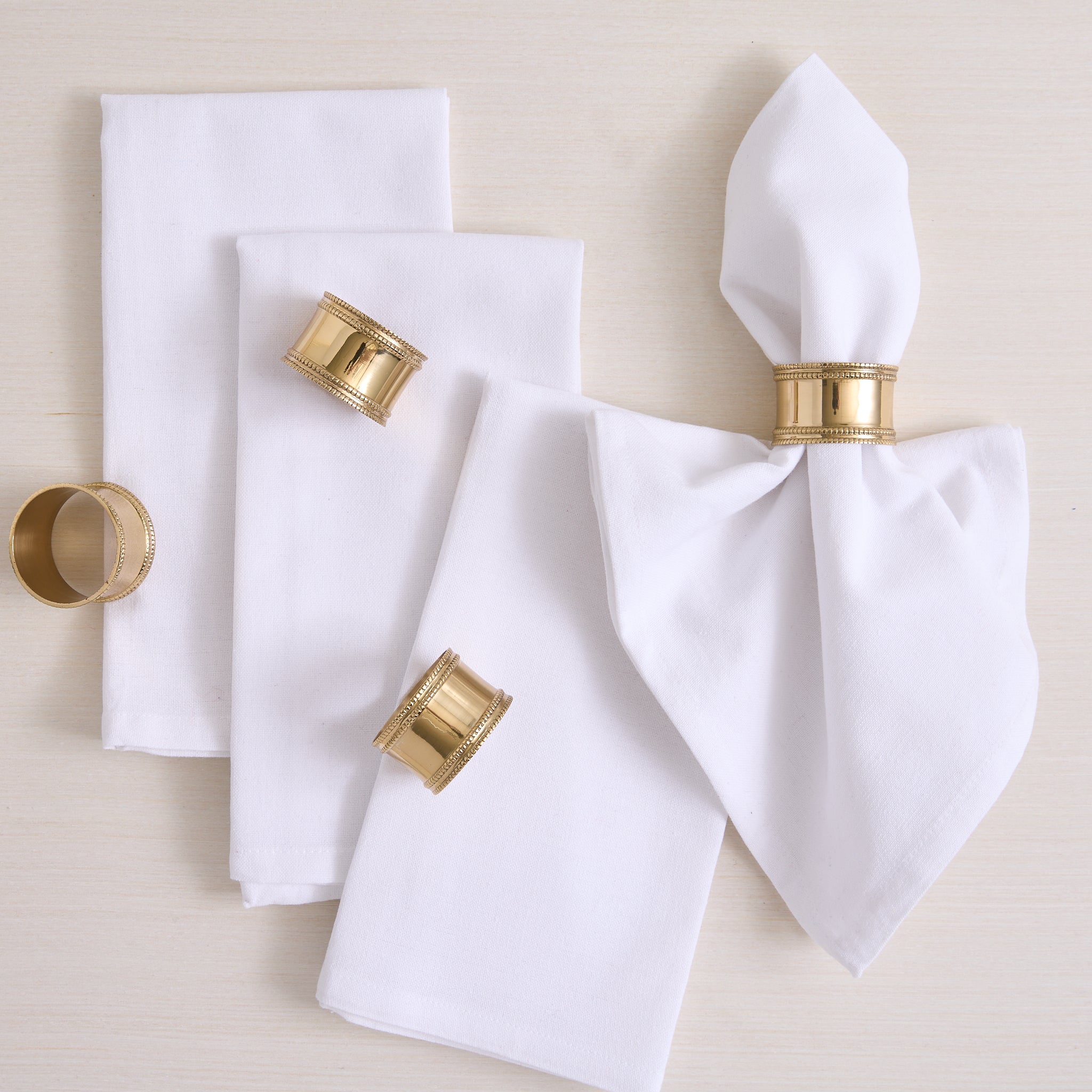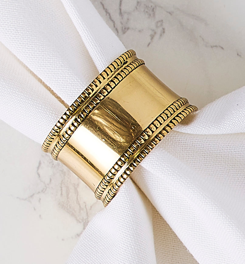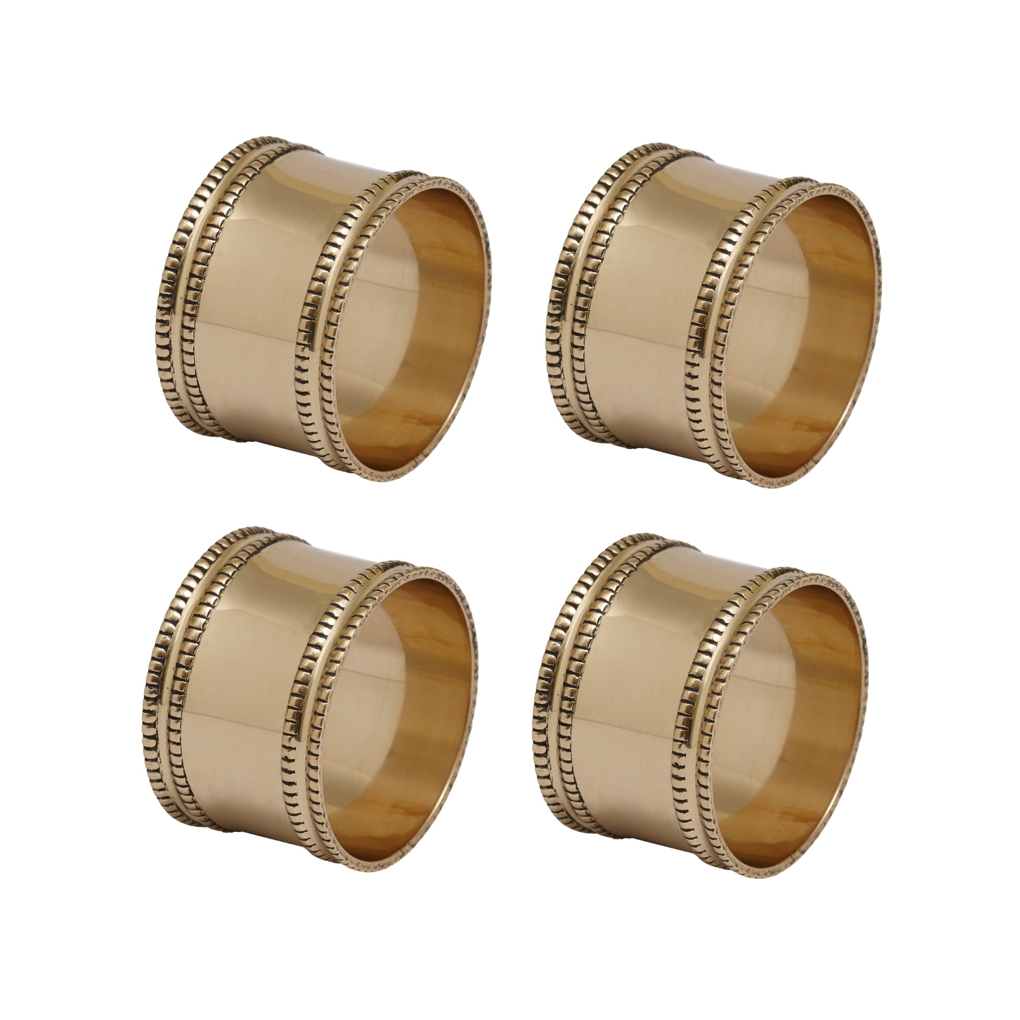 - Set includes four napkin rings, each featuring a 1.12" wide brass band with a 1.5" inside diameter