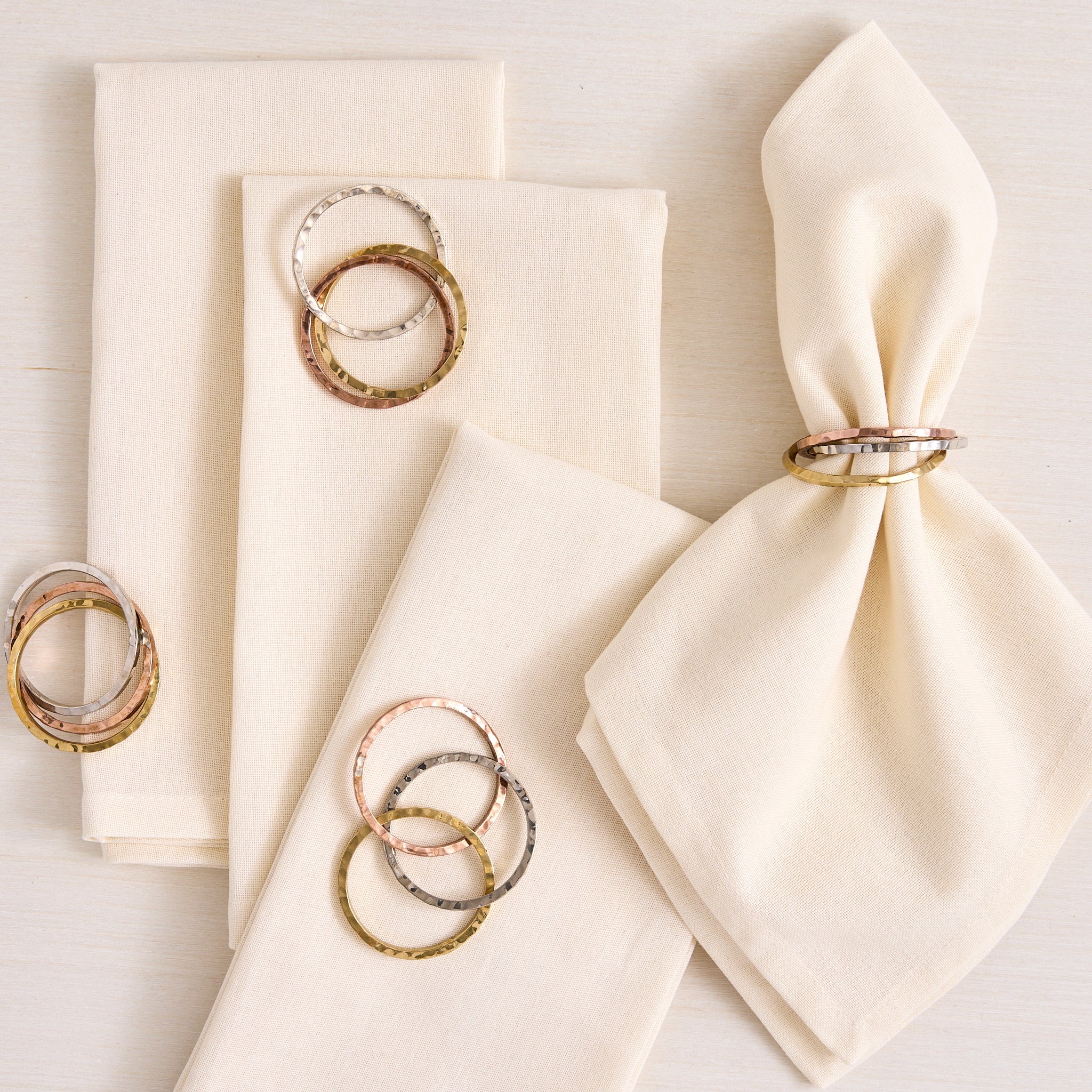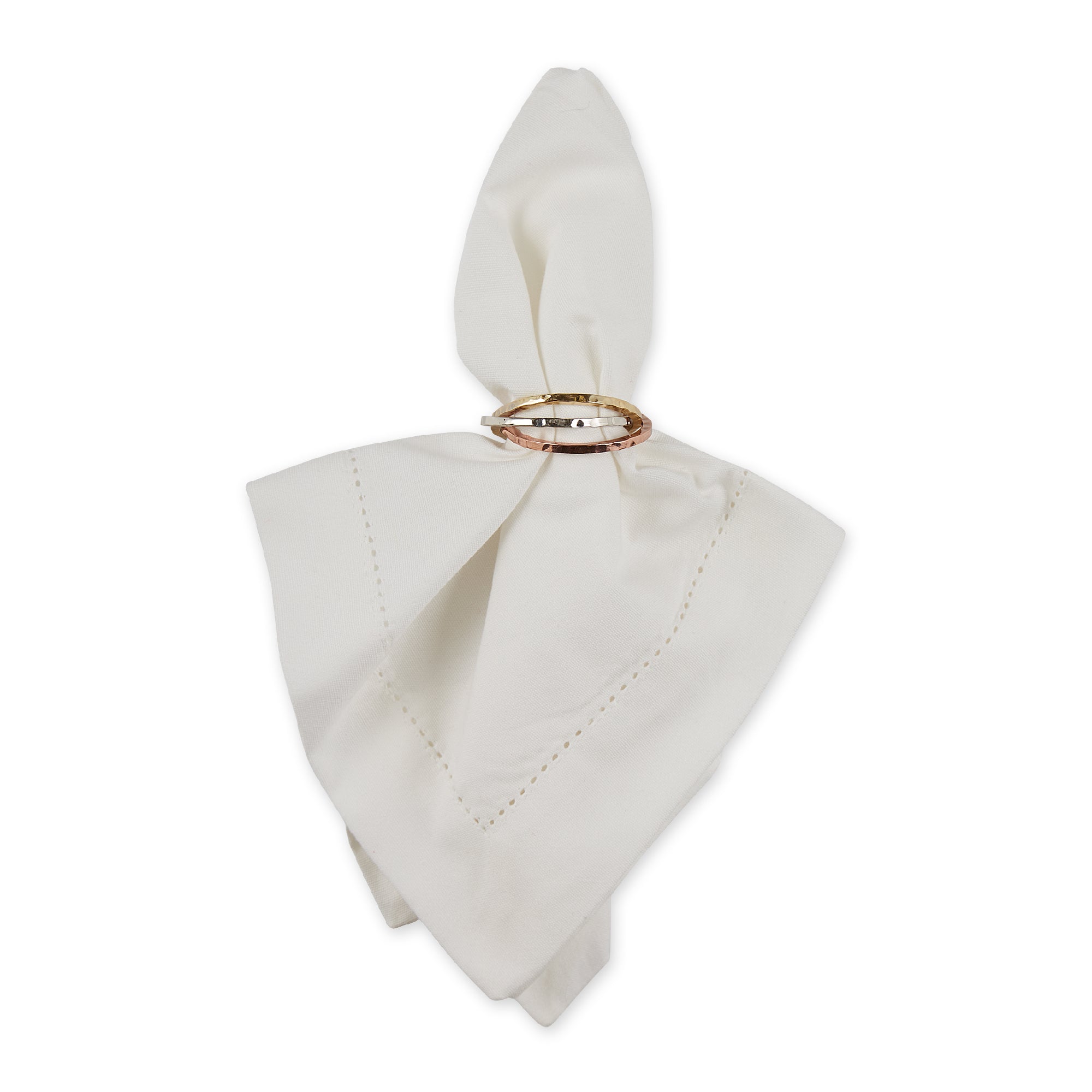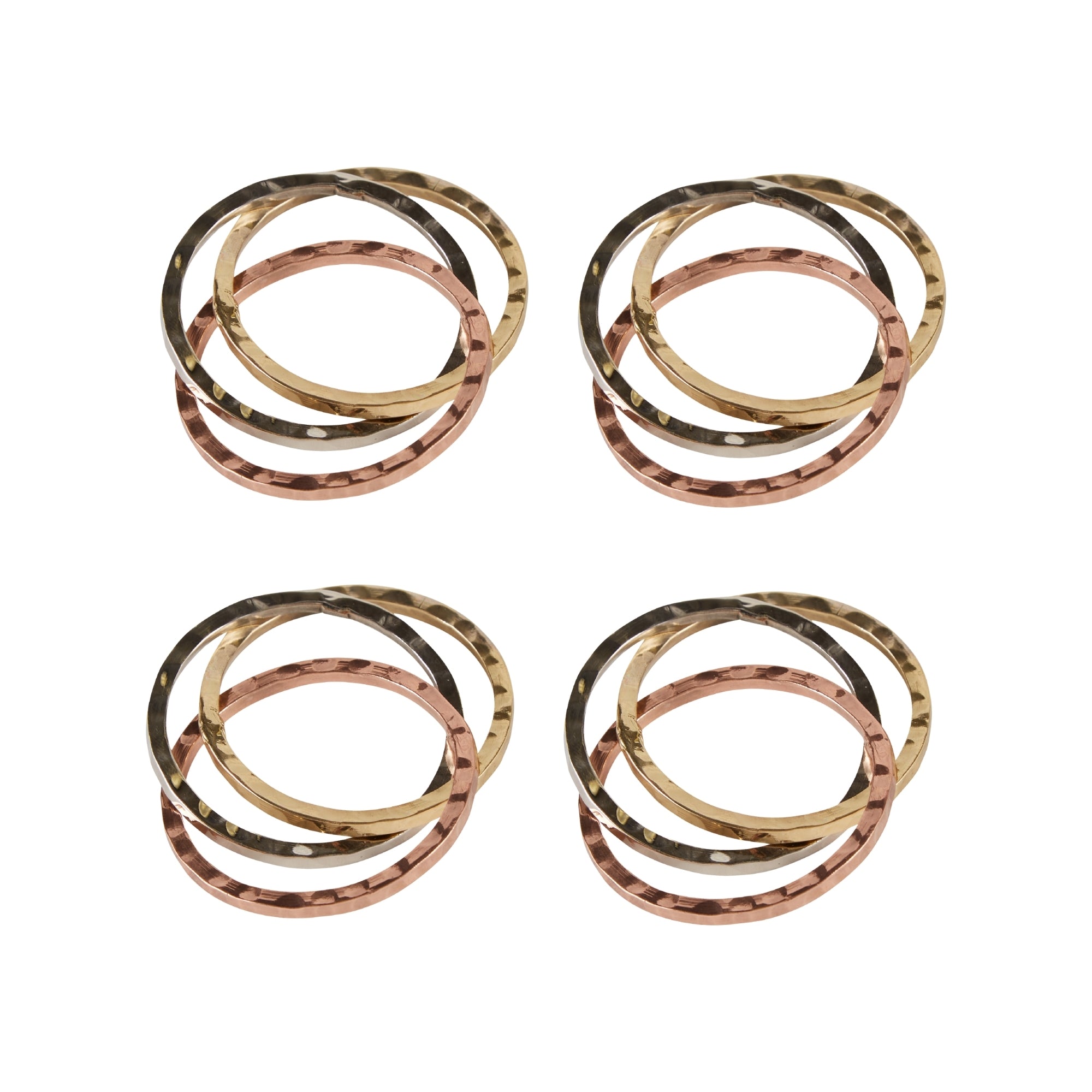 Add dimension and shine to your table setting with the Design Imports Tri Metallic Rings Napkin Ring Set. Featuring a trio of interlocked rings in gold, silver, and copper finishes, this set brings a modern twist to classic metallics. Perfect for mixing and matching with a variety of dinnerware and linens, these versatile napkin rings are ideal for entertaining year-round—from holiday gatherings to everyday meals with a bit of flair.