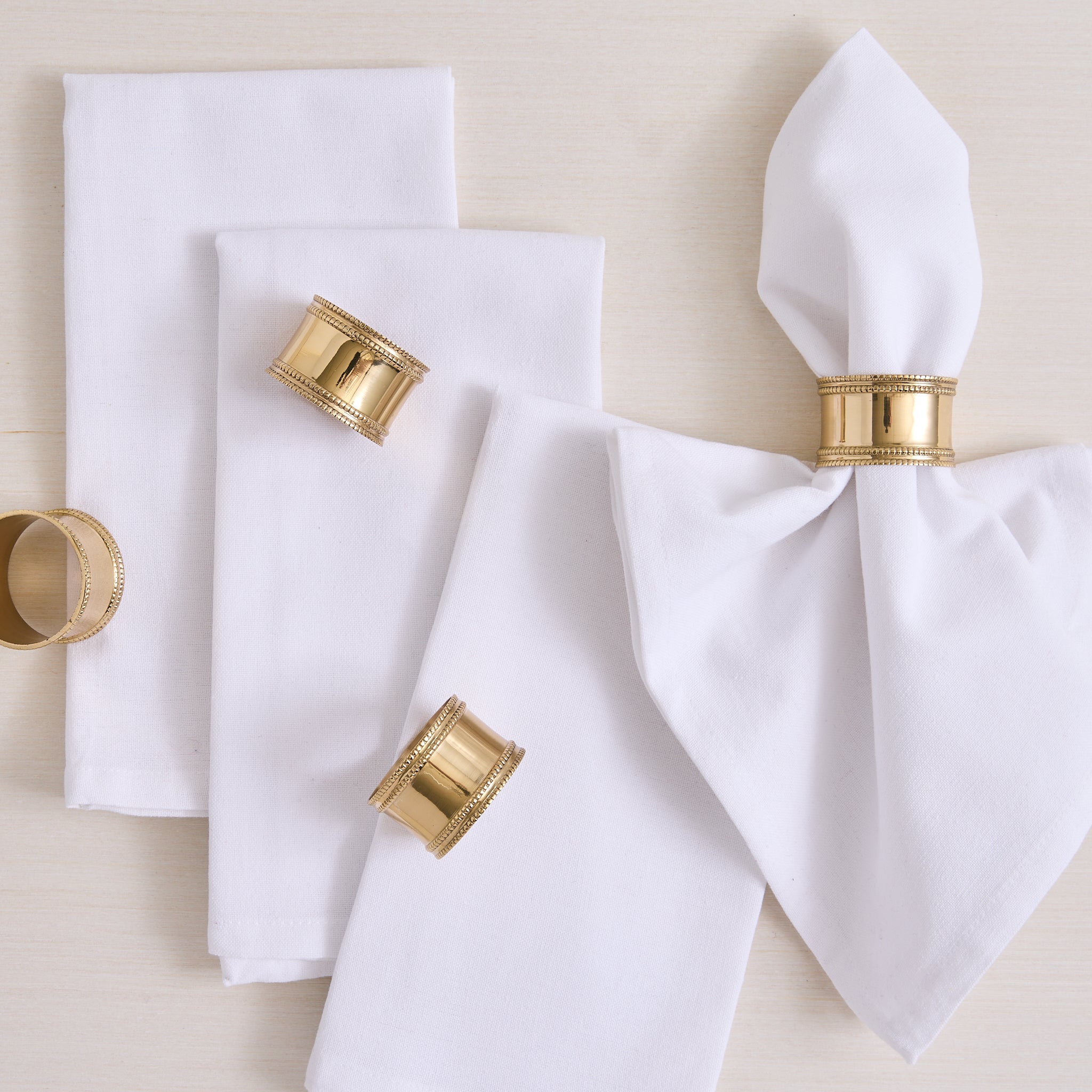 - Napkins are finished with a 1/2-inch hem and mitered corners for a clean, tailored look