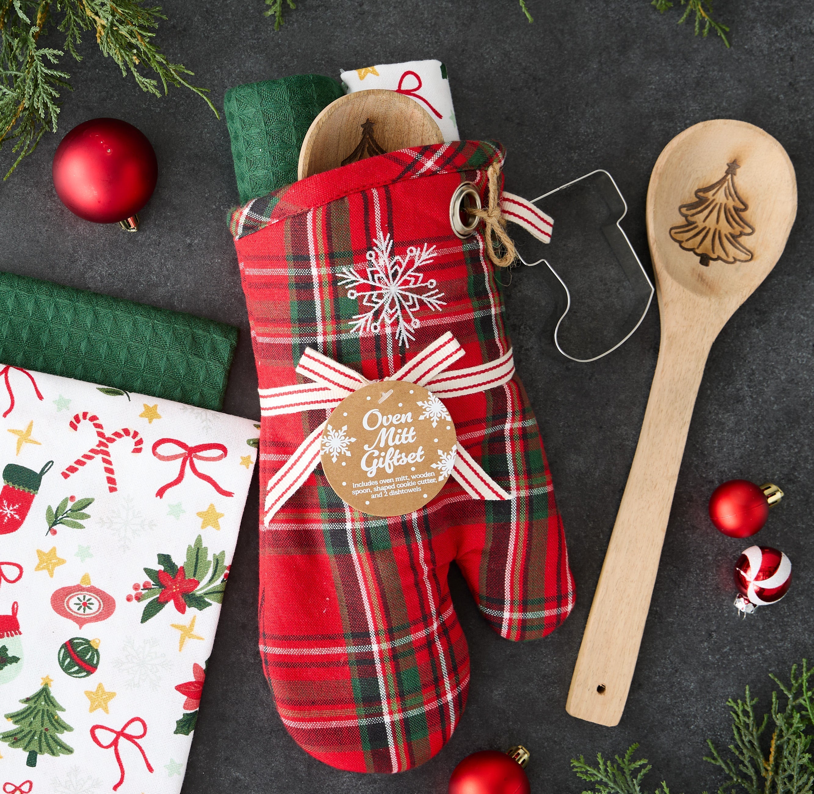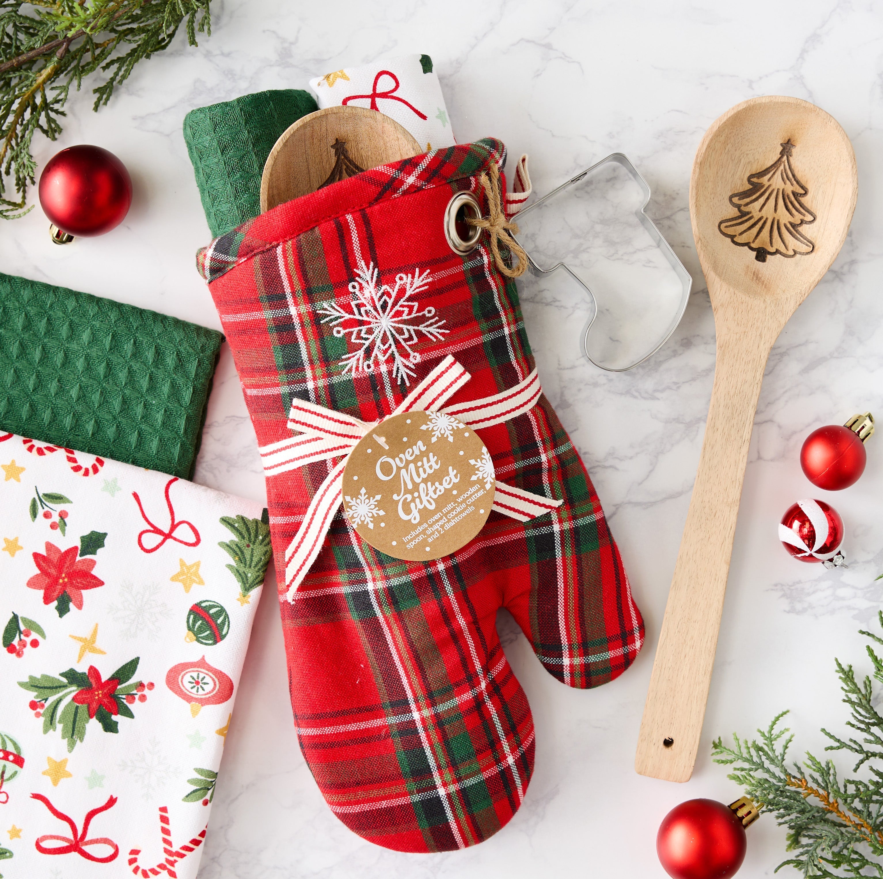 Bring festive cheer to the kitchen with the Merry Snowflake Kitchen Gift Set. This charming set includes a plaid oven mitt (6.5 x 11"), two soft dishtowels (18 x 28"), a wooden spoon (2.75 x 11"), and a snowflake cookie cutter (2.25 x 3"). Perfect for holiday baking and gifting, it’s a merry must-have for the season!