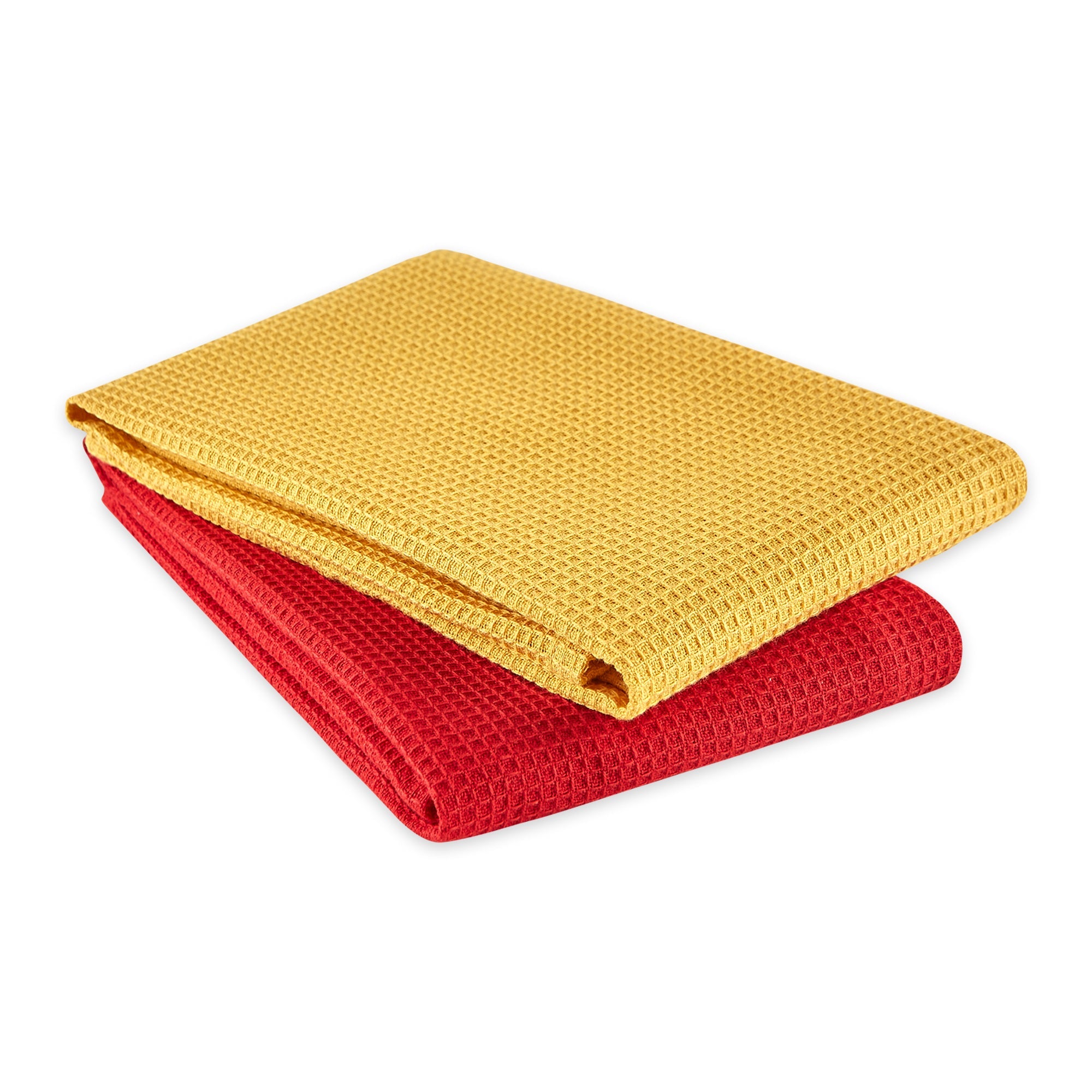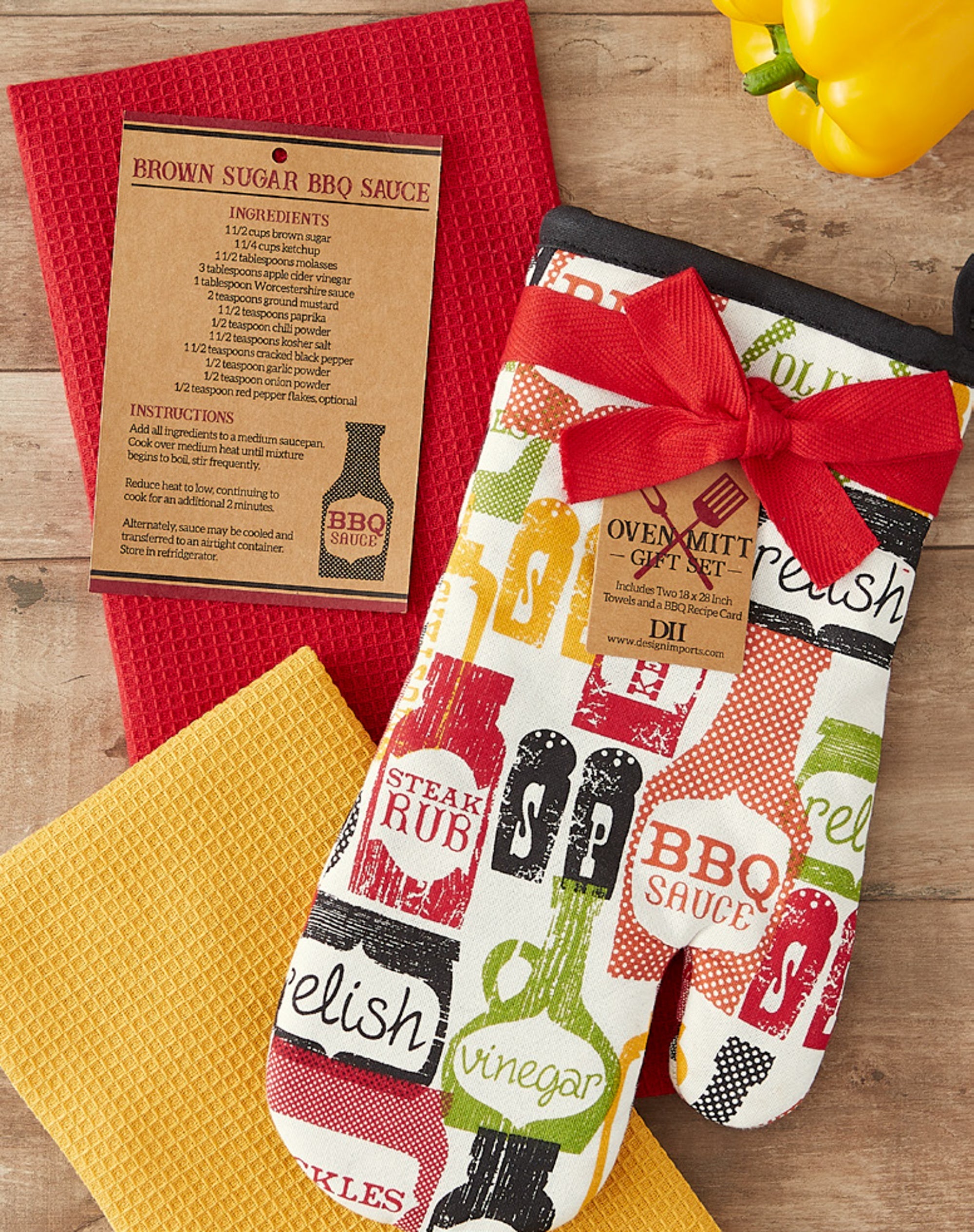 Set includes 2 waffle dishtowels, rolled inside a printed oven mitt, tied with ribbon and recipe card.
