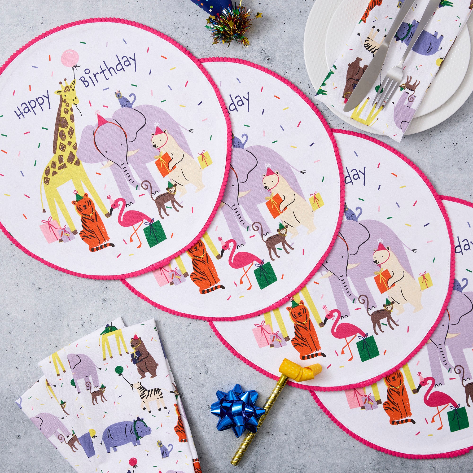 Celebrate in style with the Design Imports Animal Party Embellished Round Placemat Set. Featuring festive animal appliques and a cheerful "Happy Birthday" print, these round placemats bring joy and color to any birthday table. Crafted with detailed embellishments for added texture, they also help protect surfaces from spills, heat, and scratches. Reusable year after year, they’re the perfect way to make birthday celebrations extra special and memorable.