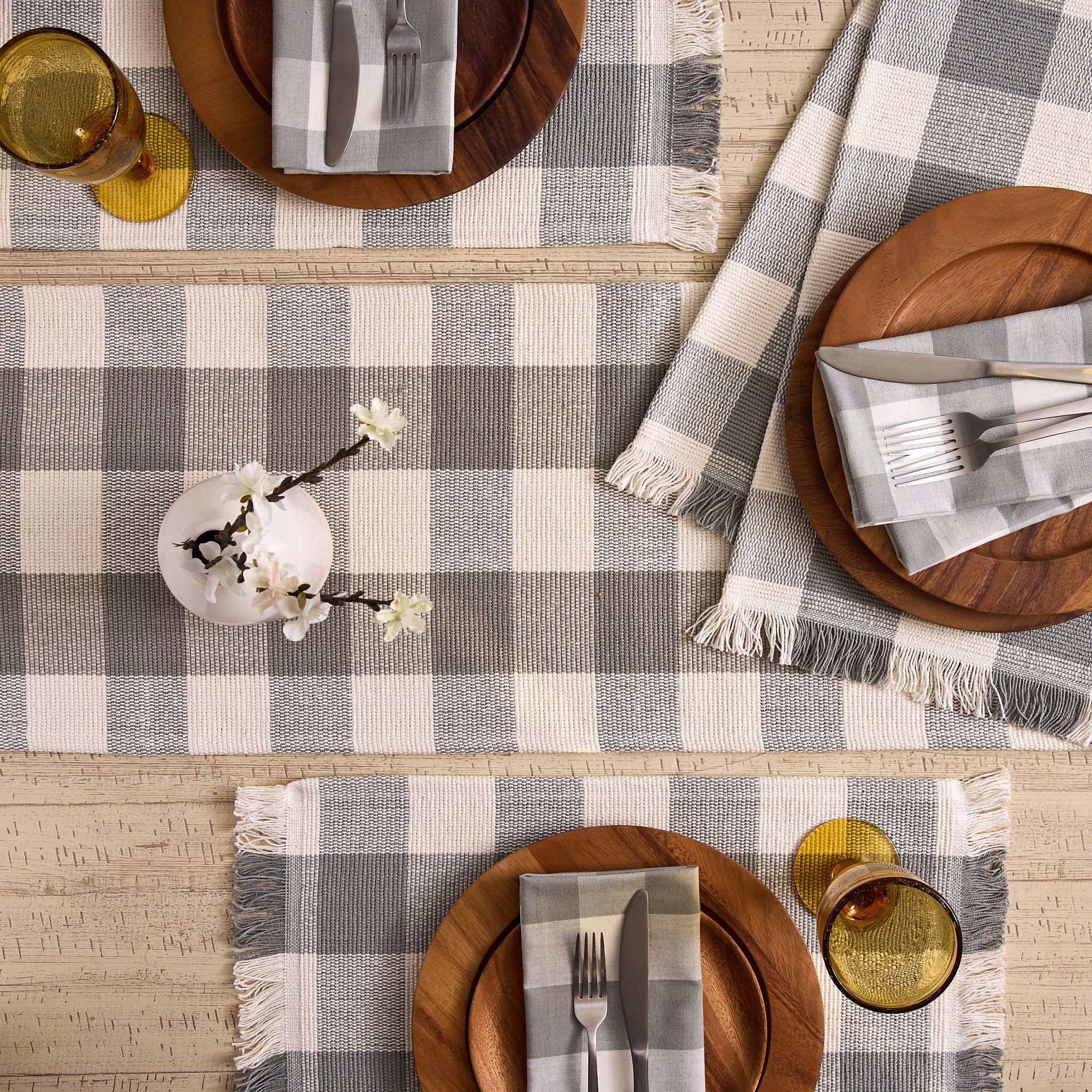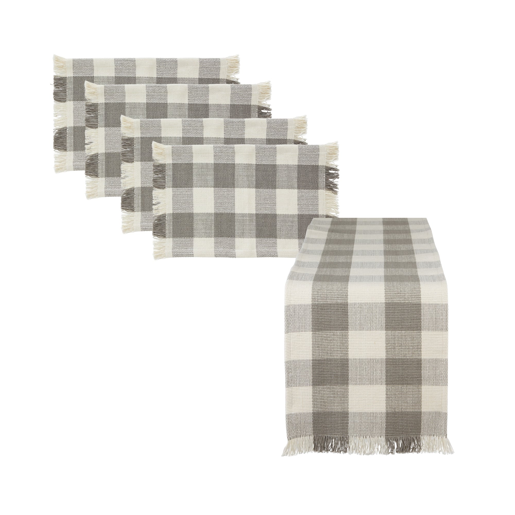 Dove Gray Check Fringe Table Runner - 13 x 108 & Placemat Set of 4