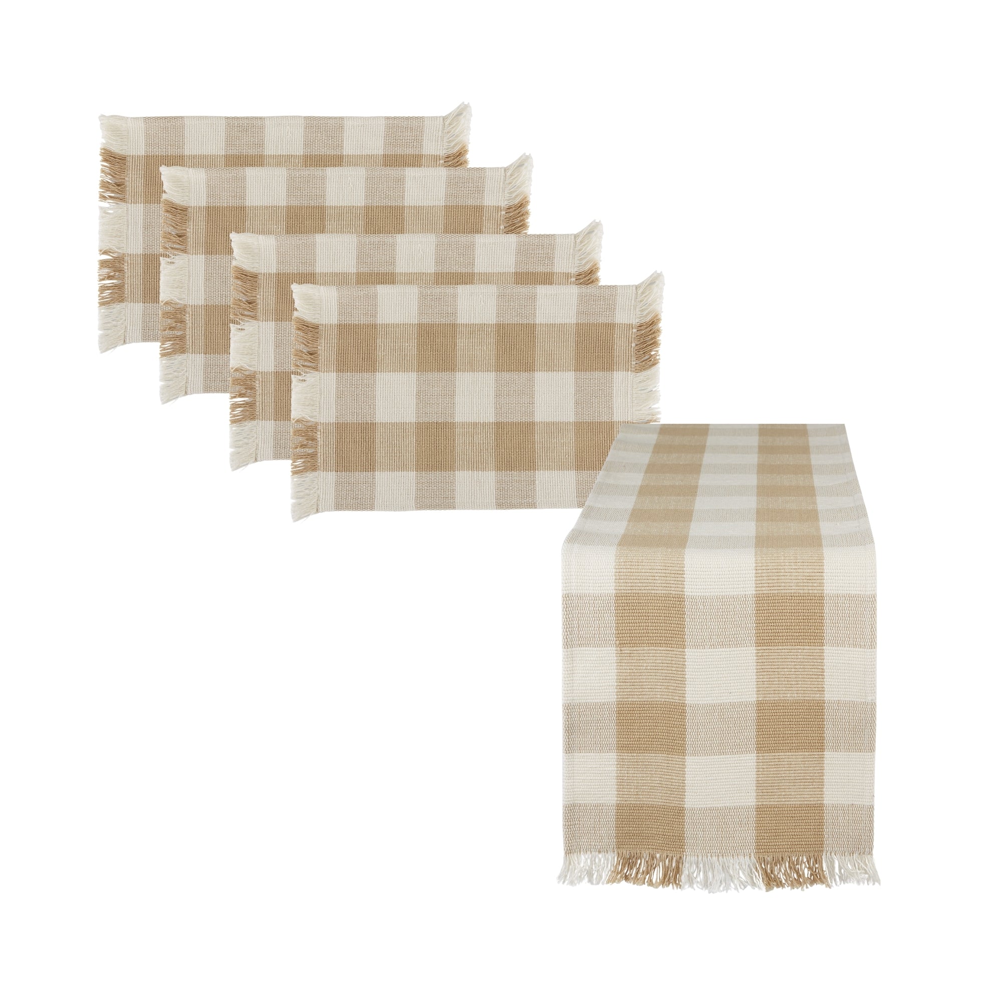 Bring timeless charm to your table with Design Imports Check Fringe Table Runner and Placemat Set. Featuring a classic check pattern in soft dove gray, the set includes one fringed table runner and four coordinating placemats. The color palette and delicate fringe trim create an inviting, farmhouse-inspired look that transitions effortlessly through every season. Perfect for everyday meals or casual gatherings, this 5-piece set adds a touch of texture and elegance to your dining space.