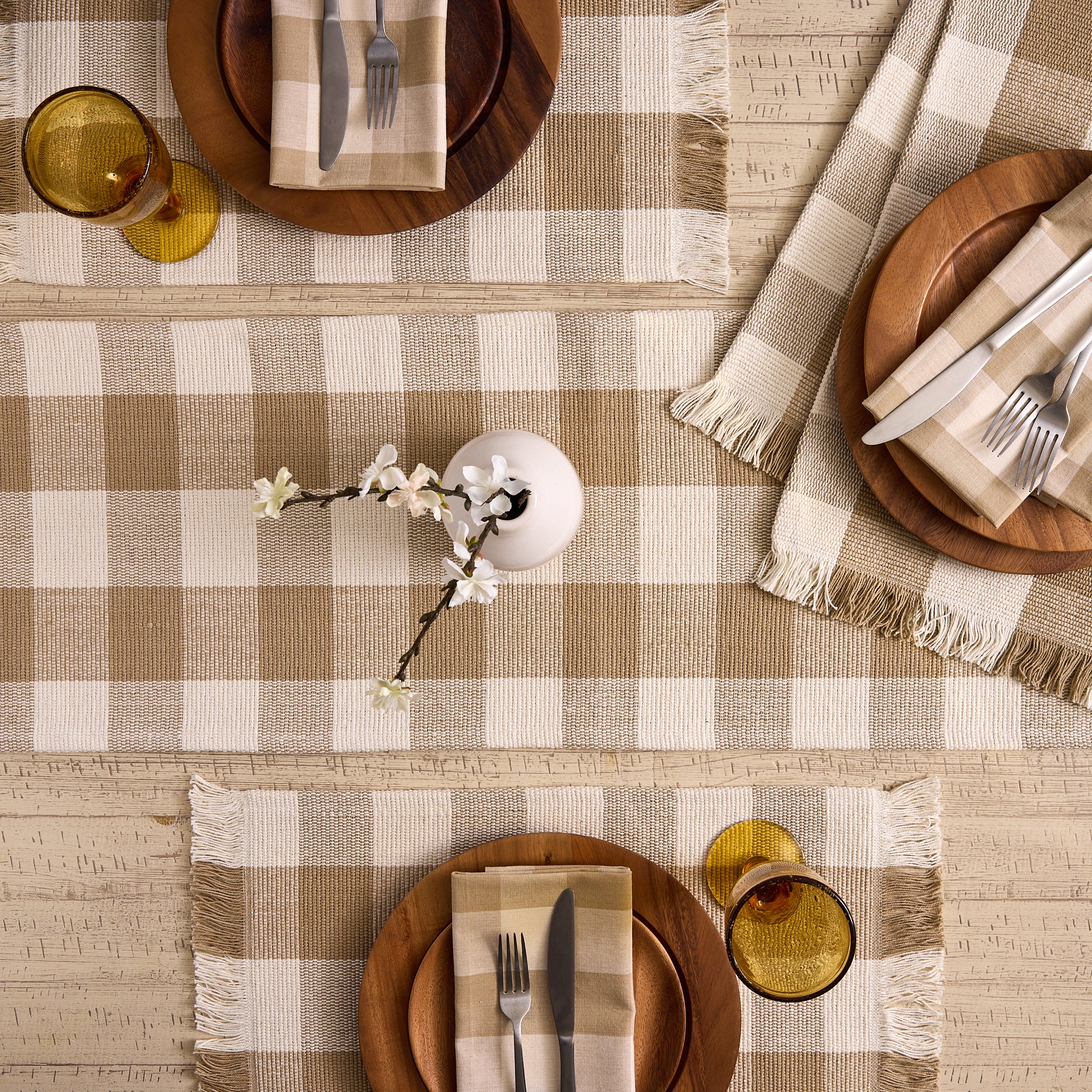 - Classic check pattern and decorative fringe brings a charming timeless inspired look to your tablescape adding visual interest and warmth to daily meals without feeling too formal
