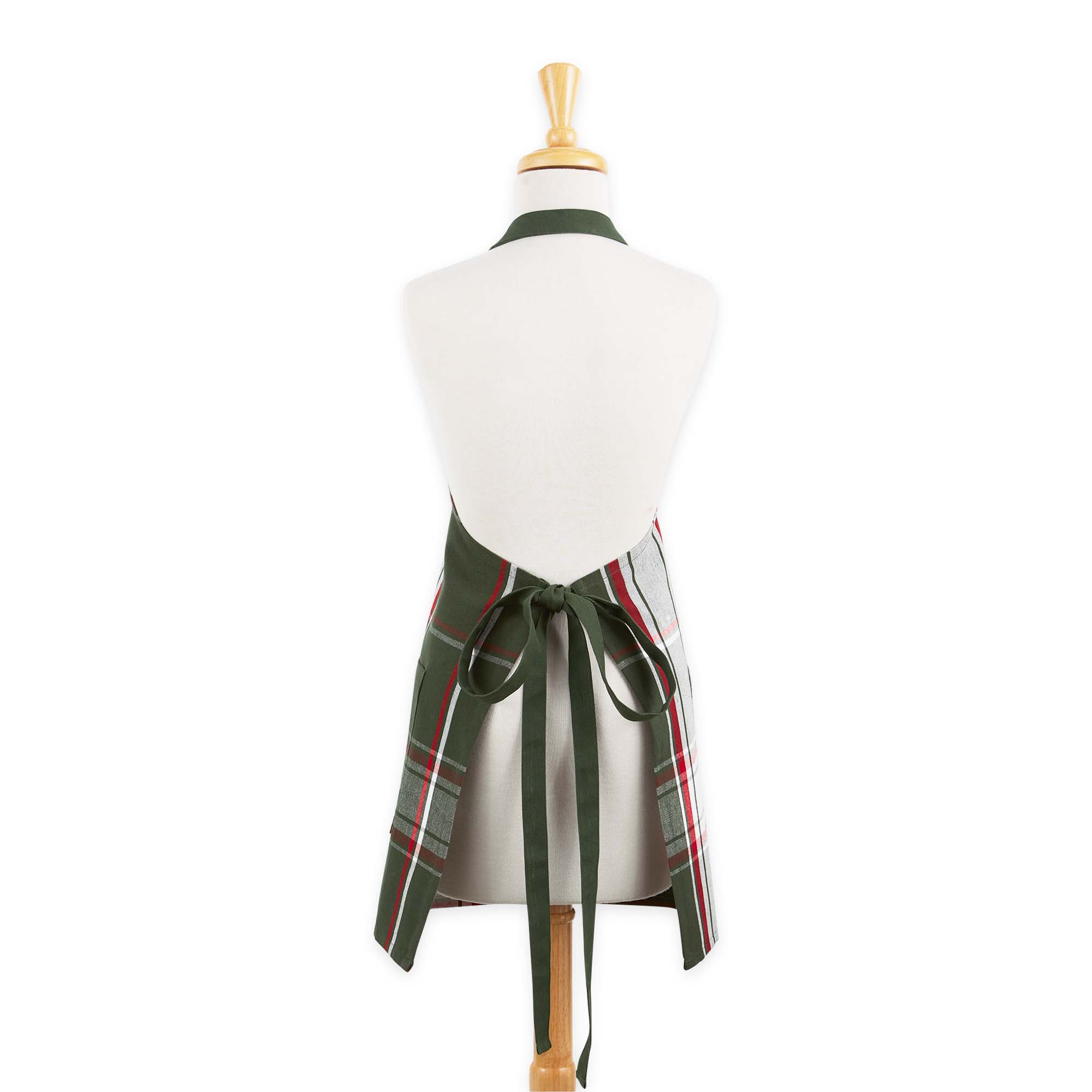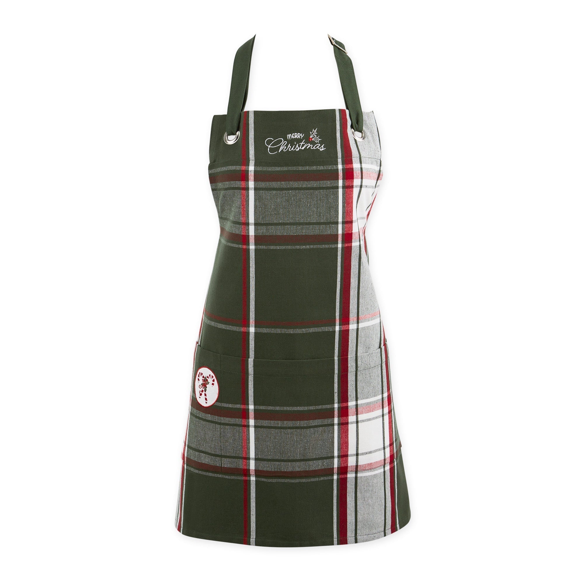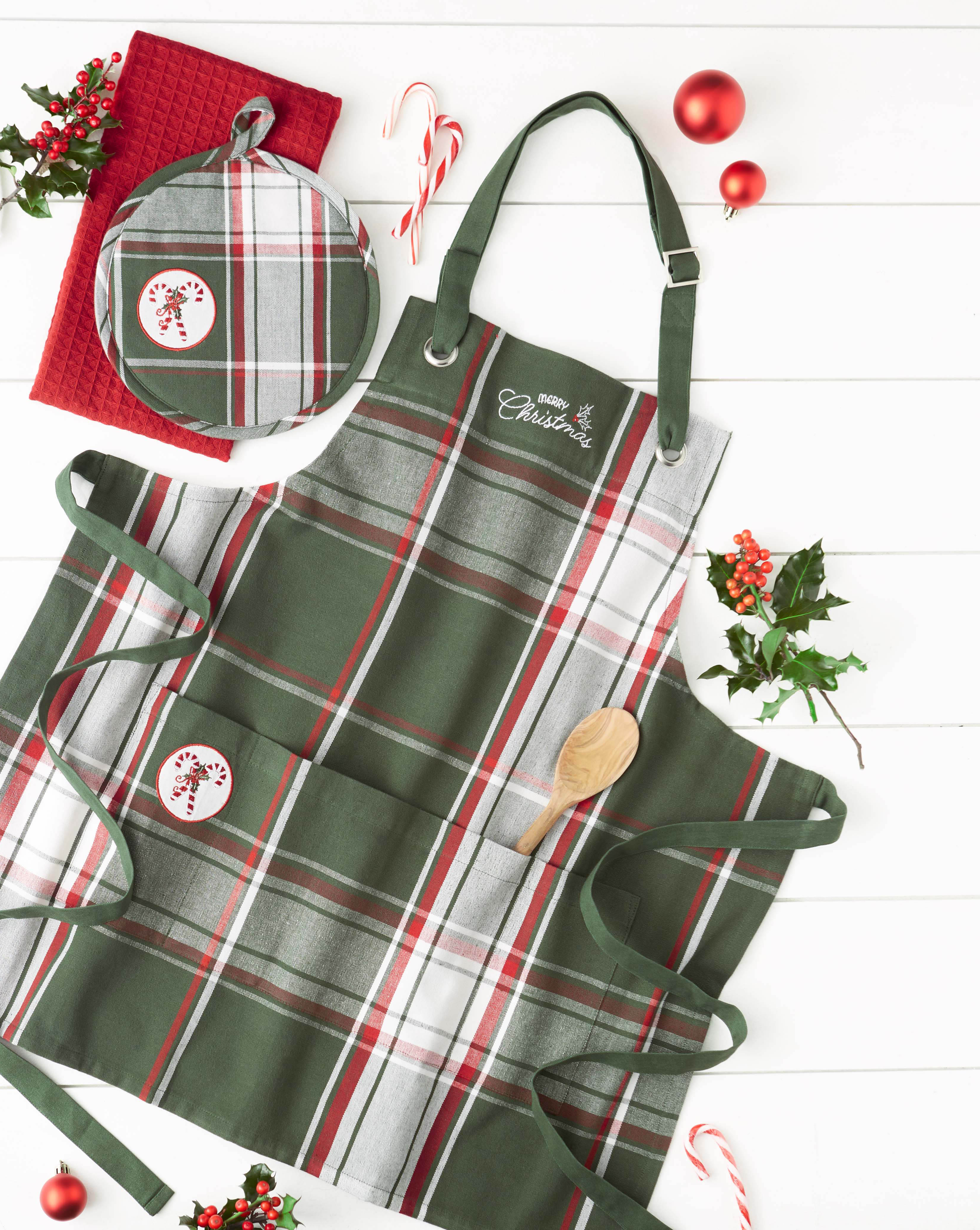 - Plaid Apron is embellished with embroidery and candy cane applique patch.