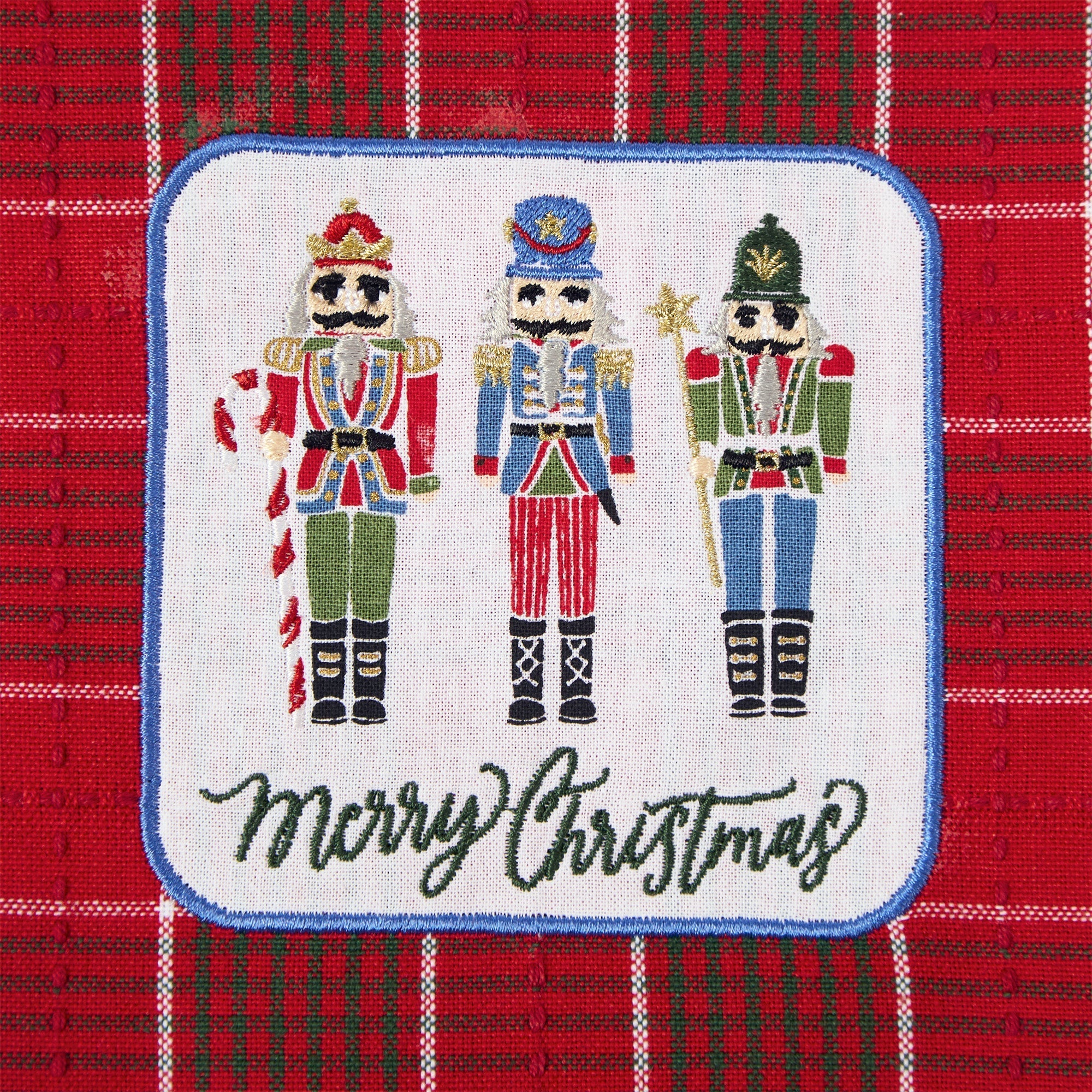 Bring festive cheer to your kitchen with the Design Imports Merry Nutcrackers Embellished Dishtowel. Made from 100% cotton, this dishtowel features a embroidered applique patch and the hem finished with coordinating ricrac trim—adding a playful holiday touch while remaining practical for drying dishes and hands. This towel includes a hanging loop for easy use and display, combining everyday function with seasonal charm.